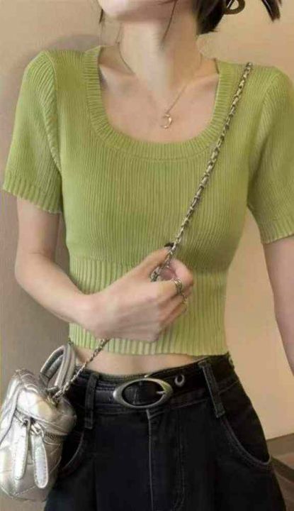 夏季新款冰丝弹力修身显瘦高腰净版简约百搭短袖针织衫,单款多色,均码面料...