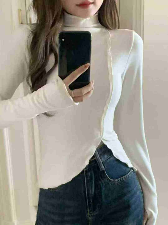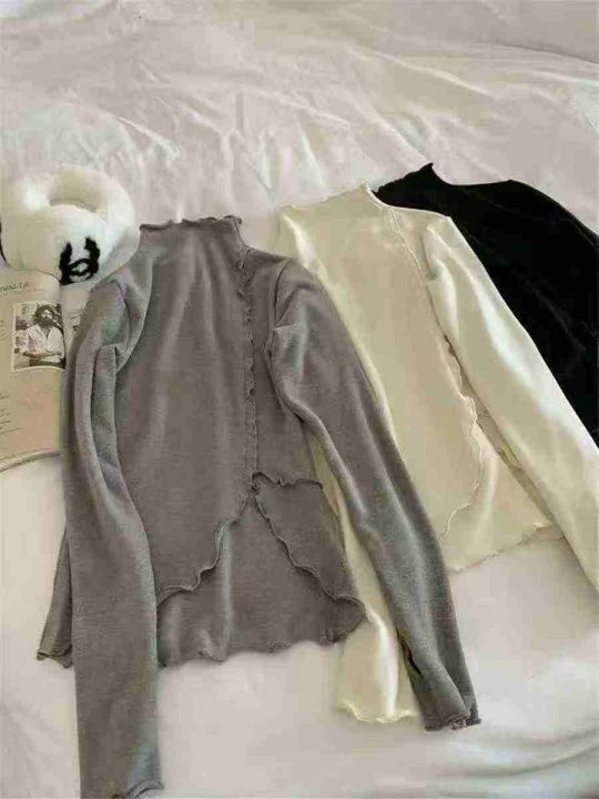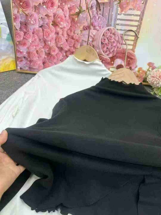 秋冬装螺纹德绒半高领T恤女设计感木耳边修身不规则百搭打底衫上衣潮,整款2色,面料软糯,弹力超大,独立包装,货品干净,1到4码,1150件左右,7.8清,分货加1