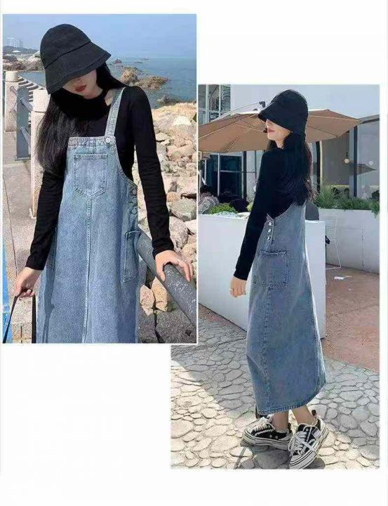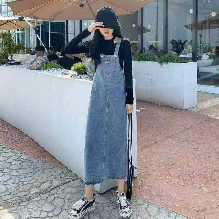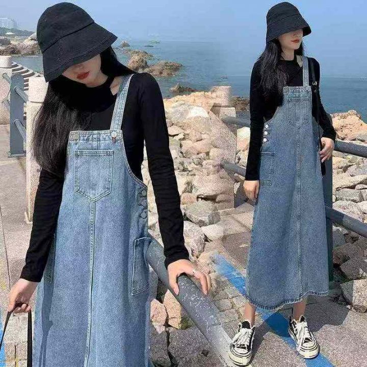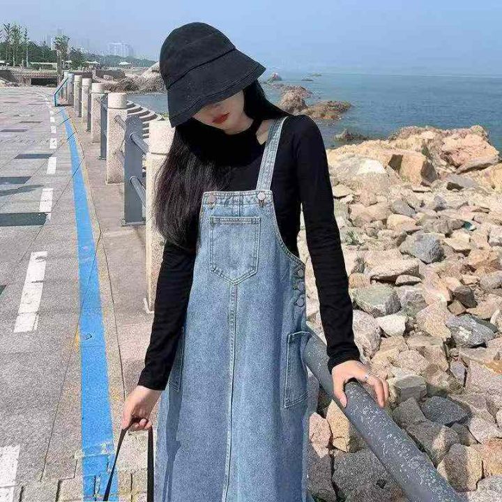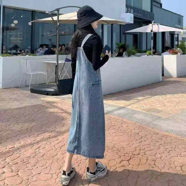 春秋新款复古韩版宽松显瘦连大码过膝背带牛仔长裙,独...