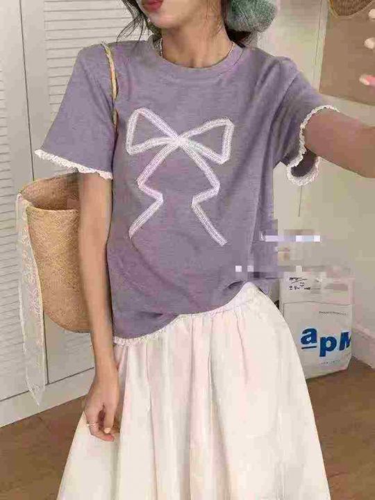 [月亮]:蕾丝花边蝴蝶结飘带设计短袖