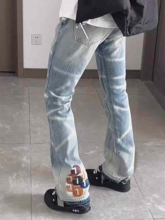 春秋新款网红美式复古水波纹渐变色刺绣毛边微喇叭男女同款宽松牛仔裤,独立包装带吊牌,码数L--3XL码(码数清单看图),320件,全清9.9元超低价秒杀!分货加一!。 货号:24862