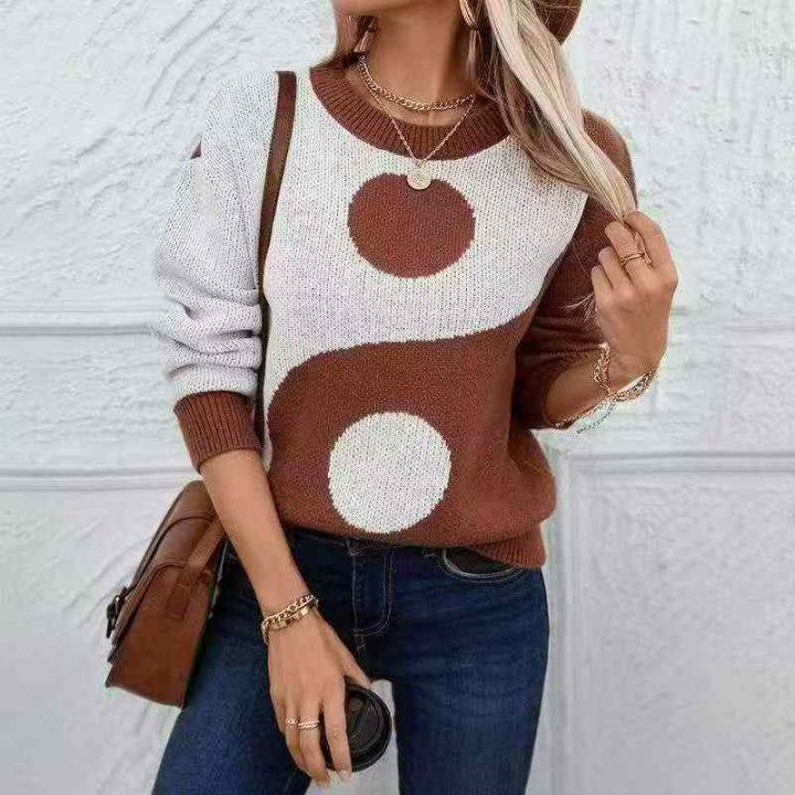 秋冬新款外贸跨境女式毛衣欧美宽松复古套头撞色毛衣,...