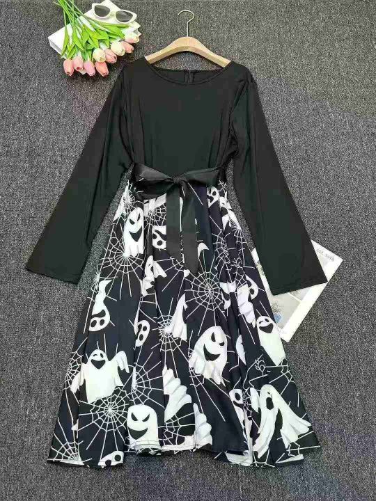 跨境电商赫本复古万圣节印花长袖大摆连衣裙送丝带,独...