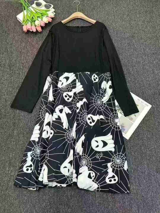 跨境电商赫本复古万圣节印花长袖大摆连衣裙送丝带,独立拉链包装,410件,XL-4XL,全清8.8
