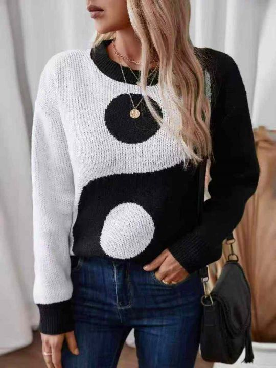 秋冬新款外贸跨境女式毛衣欧美宽松复古套头撞色毛衣,...
