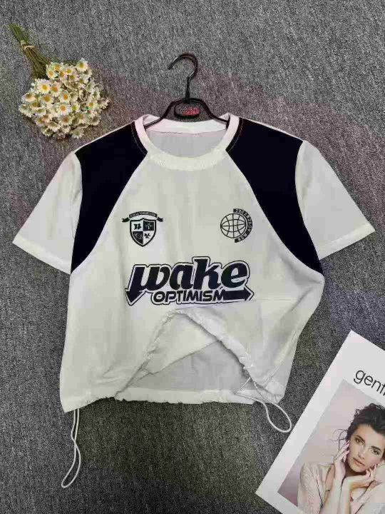 女装T恤潮流印花拼接短袖上衣,领口有包边,数量110件...