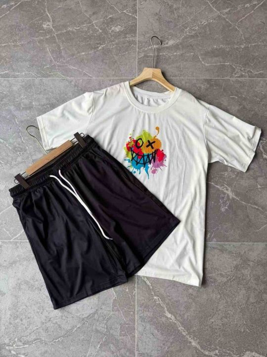 欧货潮牌夏季款休闲运动套装男女款宽松圆领短袖短裤两...