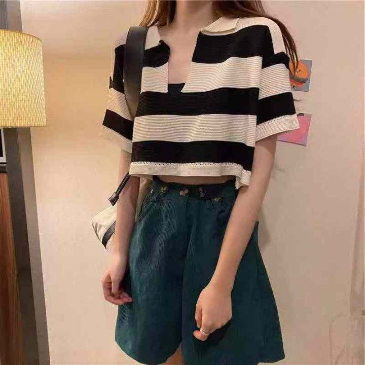 夏季新款撞色条纹宽松短款Polo领针织短袖,独立包装,...