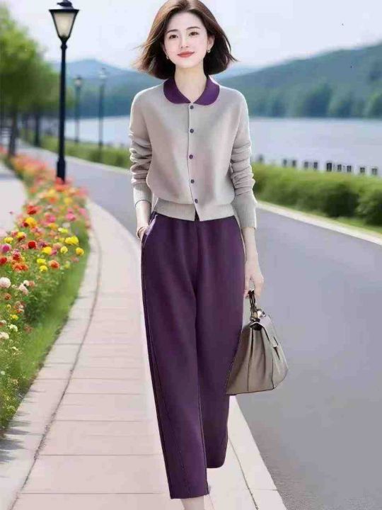 [月亮]:秋冬气质开衫纽扣上衣裤子套装