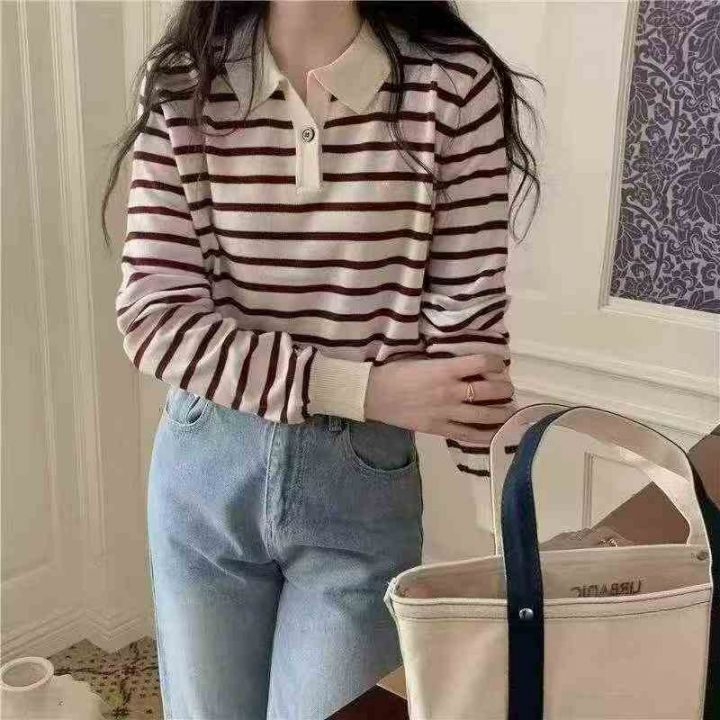 早秋新款韩系宽松高级感撞色条纹百搭POLO领长袖针织毛衣,独立包装,均码面...