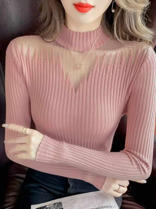 秋冬新款网纱拼接弹力修身显瘦半高领打底洋气坑条包芯纱套头毛衣,独立包装...