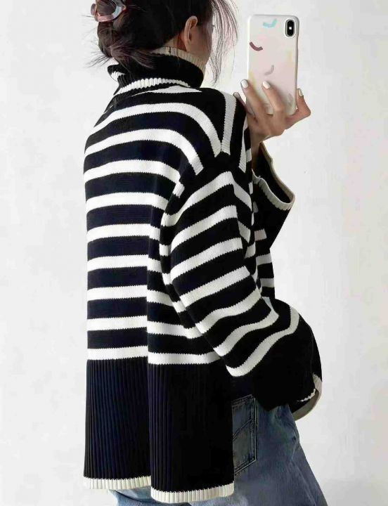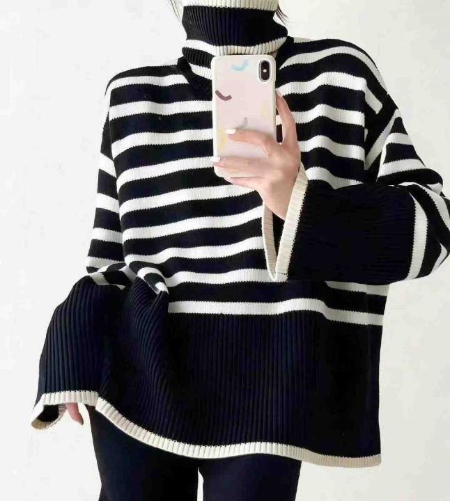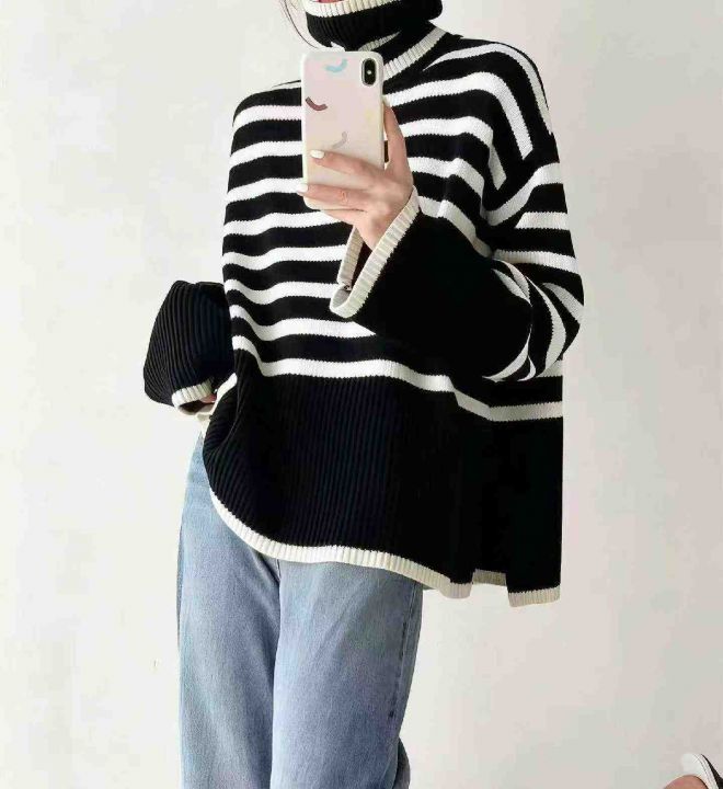秋冬新款宽松慵懒风百搭撞色条纹针织套头毛衣,独立包...