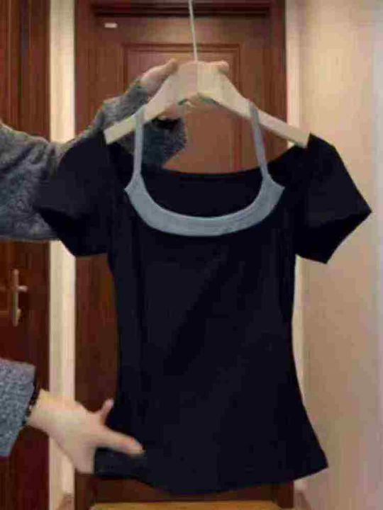 ☕️美式甜辣妹黑色挂脖短袖t恤300件全清8.8元,单款黑色,S到XL码数,独立包装。纯棉修身收腰设计感短款假两件上衣