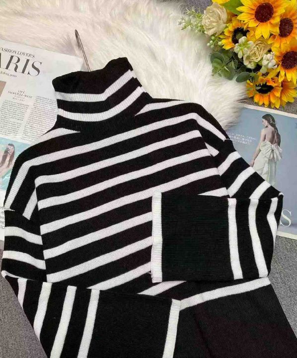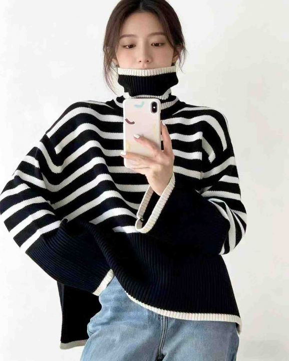 秋冬新款宽松慵懒风百搭撞色条纹针织套头毛衣,独立包...