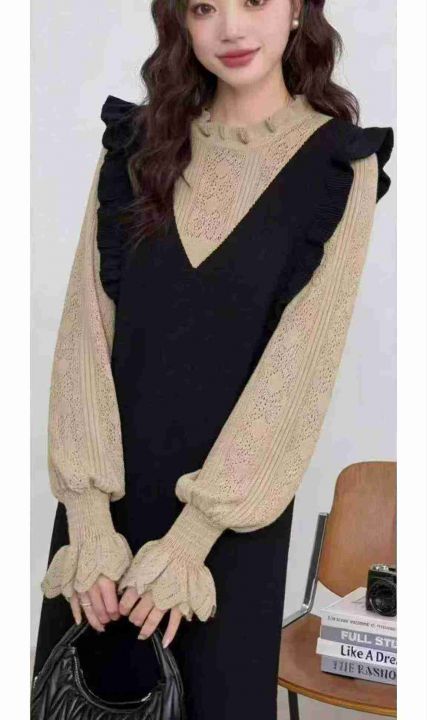 秋冬新款韩系气质荷叶边假2件复古宽松慵懒风针织毛衣...