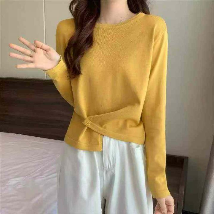 春季新款韩系风净版设计感不规则下摆圆领长袖针织衫,独立包装,均码面料柔...