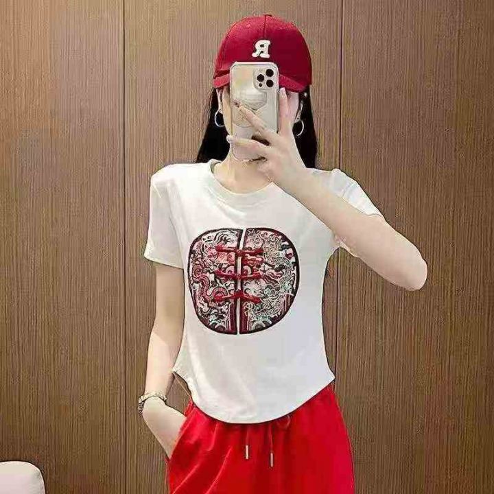 ☕️新中式刺绣独特别致上衣女夏季装大码宽松正肩辣妹T恤280件全清6.8元,...