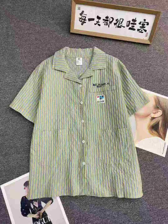 复古条纹短袖衬衫114件8.8,后领包边到件,字母刺绣,宽松版,有口袋,码数...