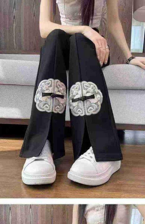 ☕️罗马高弹力新中式开叉微喇裤子女夏季新款阔腿直筒国风喇叭休闲裤170条...