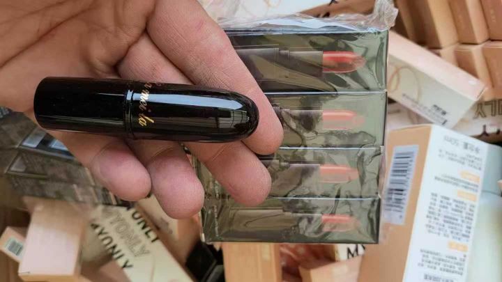 眼影盘三百多斤,杂货两百来斤,唇釉三四百斤,口红一...