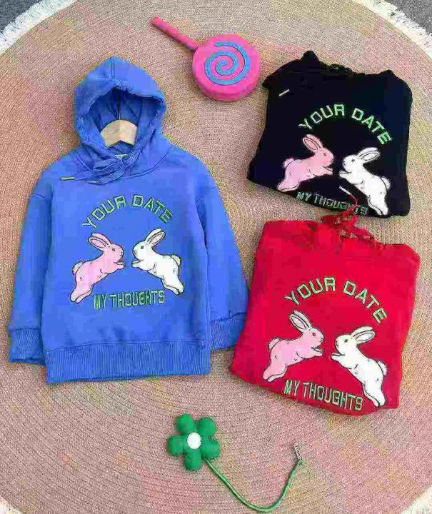 1469件高品质兔子刺绣连帽加绒儿童卫衣。双层连帽设计,后领包边,面料柔软舒适,看得见的品质。码数清单看大货图,拉链式独立包装带品牌。全清7.8分货加1
