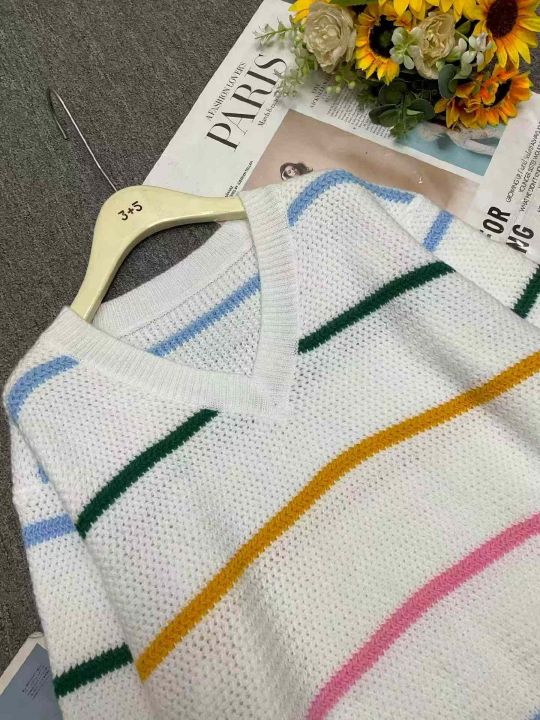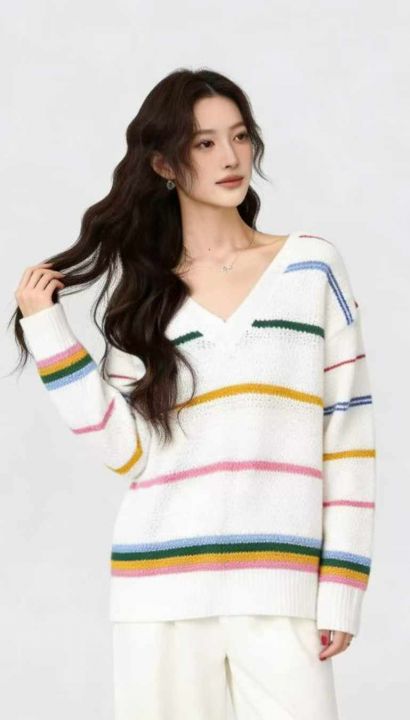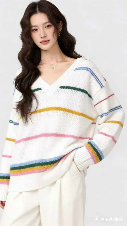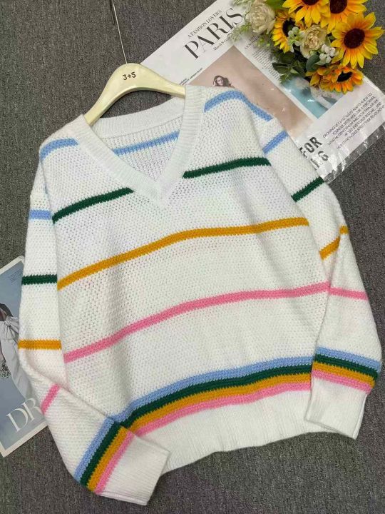 公司原单秋冬新款宽松慵懒等撞色条纹V领套头毛衣,独立包装,码数S- 2XL码,136件,全清7.9元超低价秒杀!
