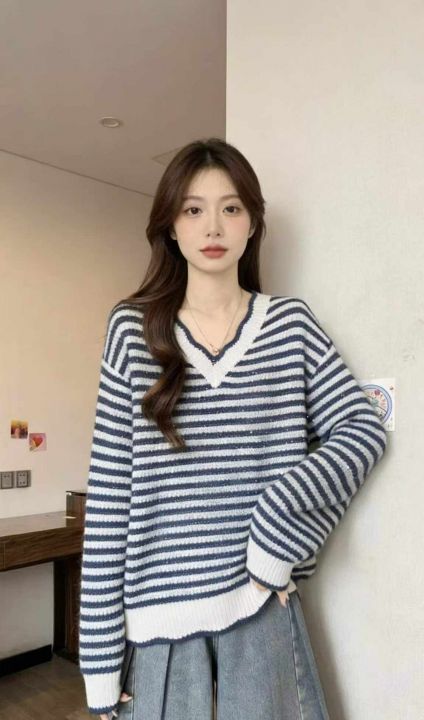 公司原单秋冬新款宽松慵懒等撞色条纹V领套头毛衣,独立包装,码数S- 2XL码,97件,全清7.9元超低价秒杀!
