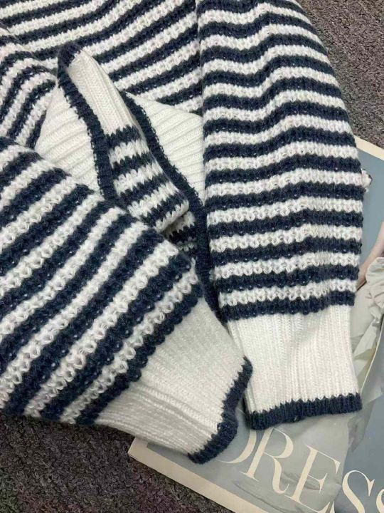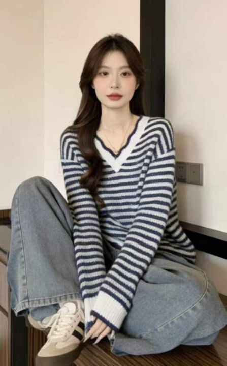 公司原单秋冬新款宽松慵懒等撞色条纹V领套头毛衣,独...