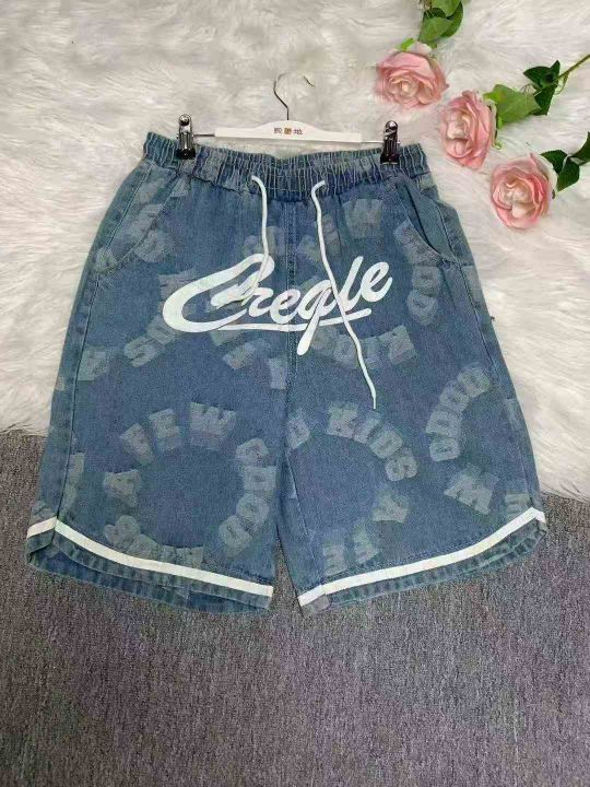 美式潮牌印花牛仔短裤男士夏季高街宽松直筒五分裤90件...