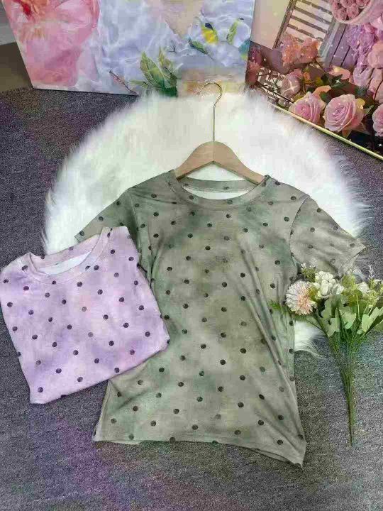 重工晕染波点圆领短袖T恤女夏季设计感显瘦遮肉气质上衣,整款2色,紫色为主,弹力超大,2到5码,3200件左右,4.9秒杀,分货加1