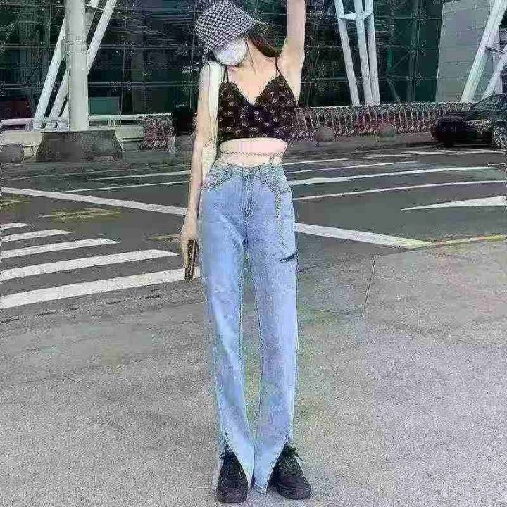 垂坠感女装mm宽松显瘦高腰破洞开叉牛仔裤,网络图仅供参考,码数:XS-XL,数量281条,独立包装