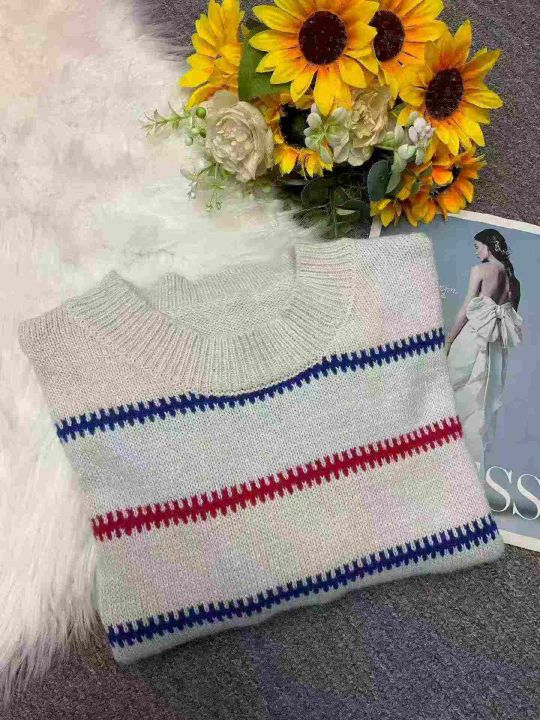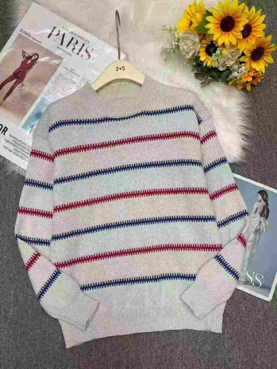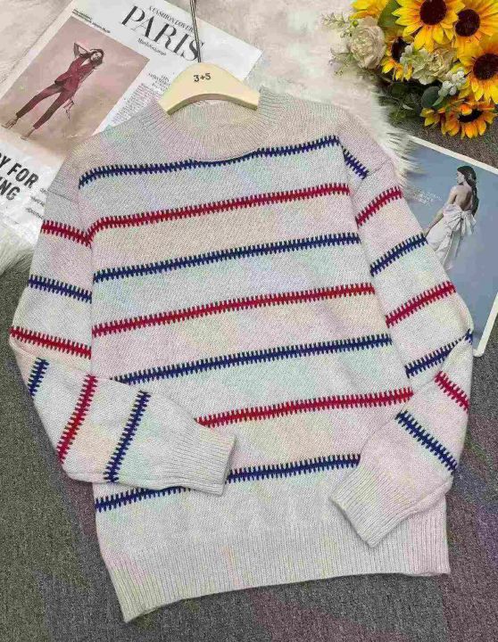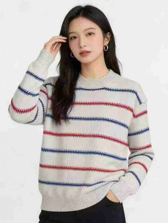 秋冬新款撞色条纹宽松慵懒风北极绒套头毛衣,独立包装...
