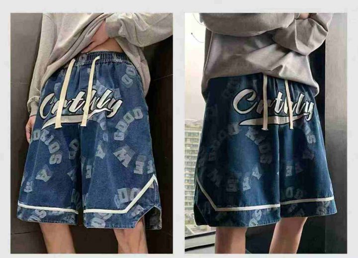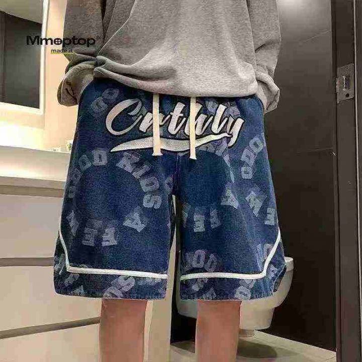 美式潮牌印花牛仔短裤男士夏季高街宽松直筒五分裤90件...