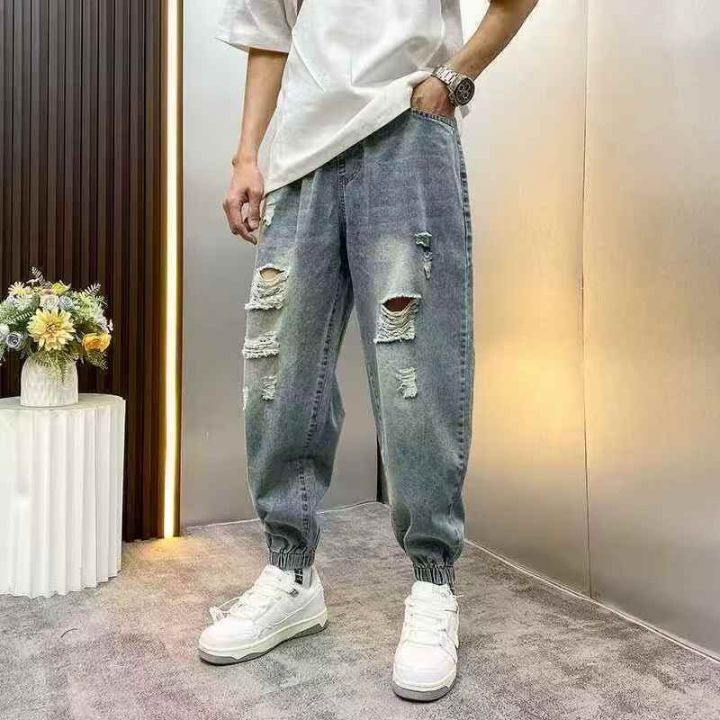 男士破洞牛仔裤2025新款宽松束脚百搭哈伦潮裤100件,...