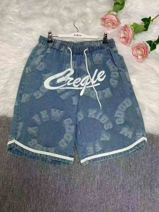 美式潮牌印花牛仔短裤男士夏季高街宽松直筒五分裤90件...