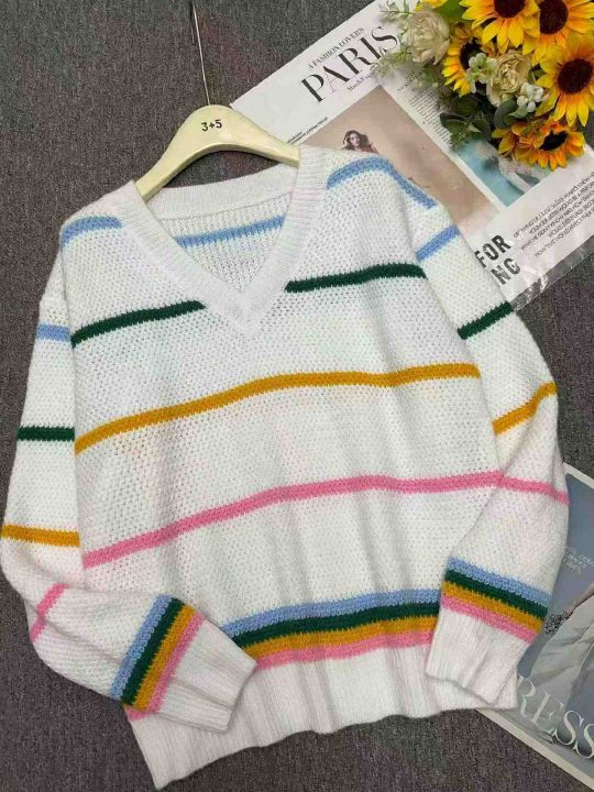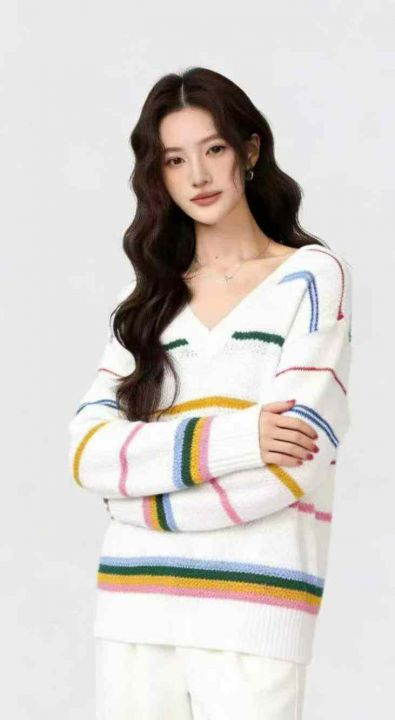 公司原单秋冬新款宽松慵懒等撞色条纹V领套头毛衣,独立包装,码数S- 2XL码,136件,全清7.9元超低价秒杀!。 货号:24862
