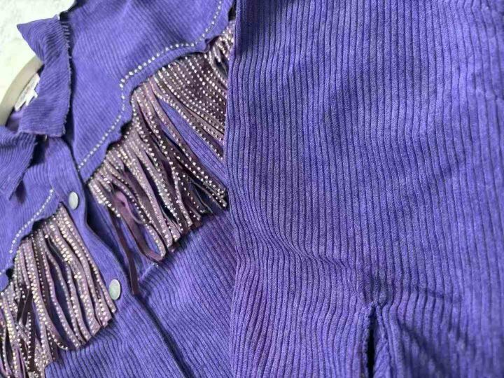 142件秋冬新款休闲紫色铆钉流苏翻领灯芯绒外套,宽松...