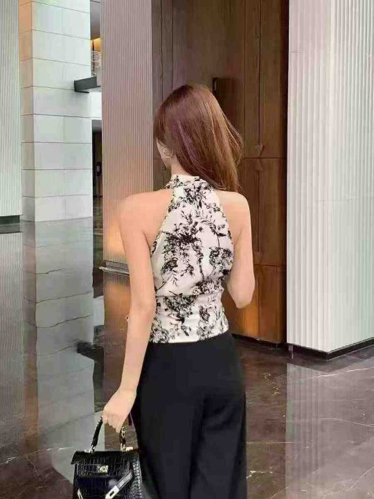 87件法式系带雪纺印花无袖挂脖背心上衣女夏轻熟法式小众高级感短款小衫,尺...