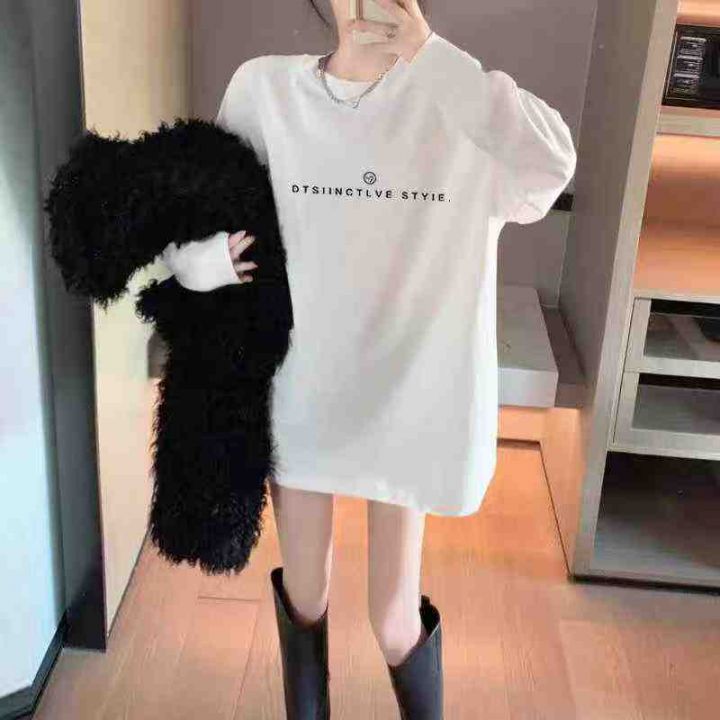 圆领/半高领德绒打底衫女新款内搭宽松白色印花中长款长袖T恤,2种款式,圆...