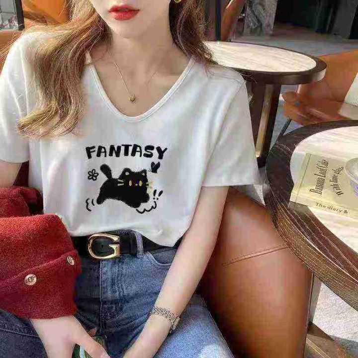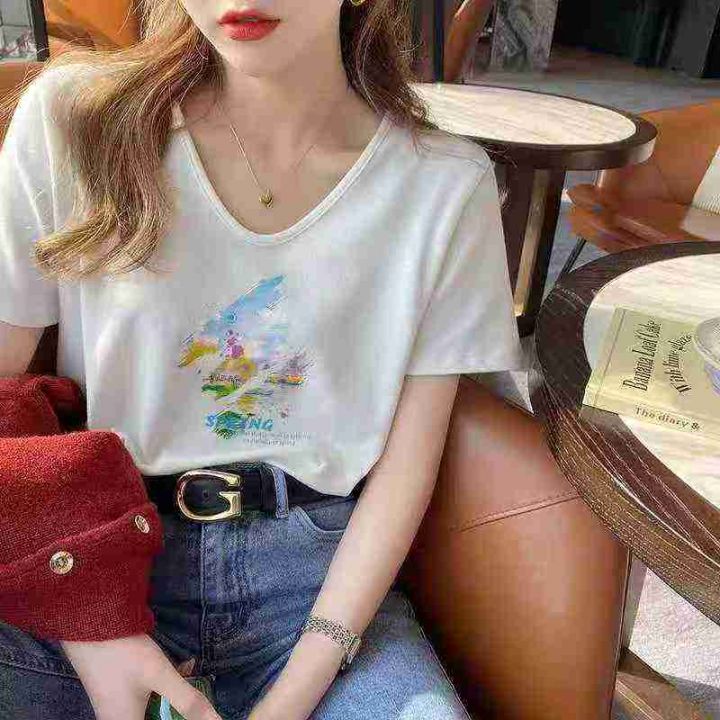 2.5清电商仓回收833件靓妹设计款印花宽松显瘦落肩V领T...