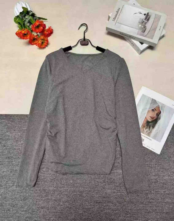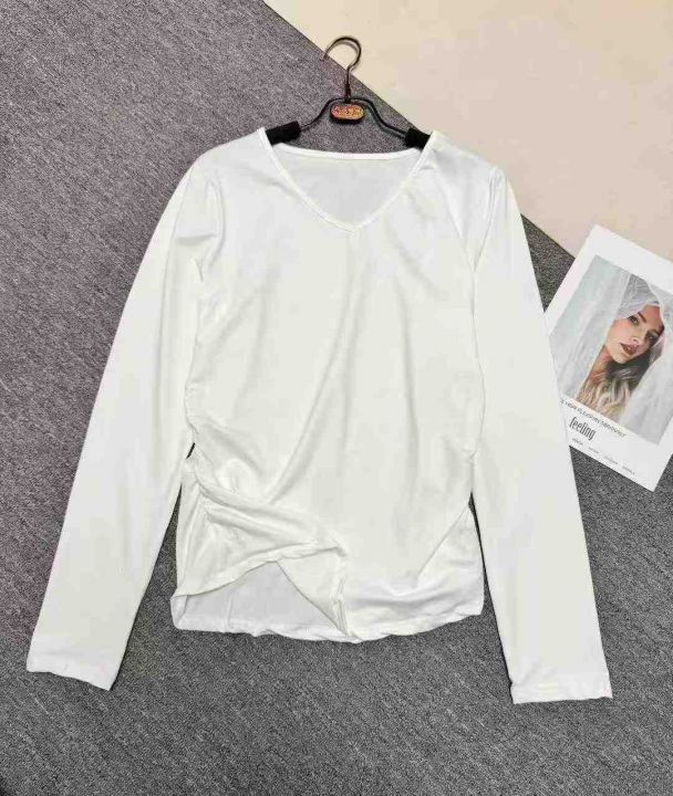 春季新款纯色V领/圆领长袖打底衫T恤女时尚简约褶皱收腰设计感上衣 ,数量 658 件,图片款,品质好,有包装。全清2.8