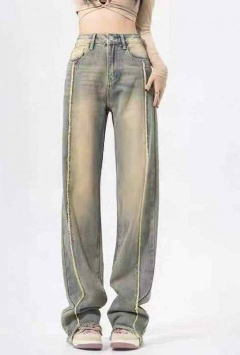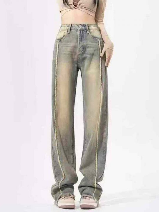 秋冬新款洗水棉网红高街高腰美式复古辣妹直筒黄泥染牛...