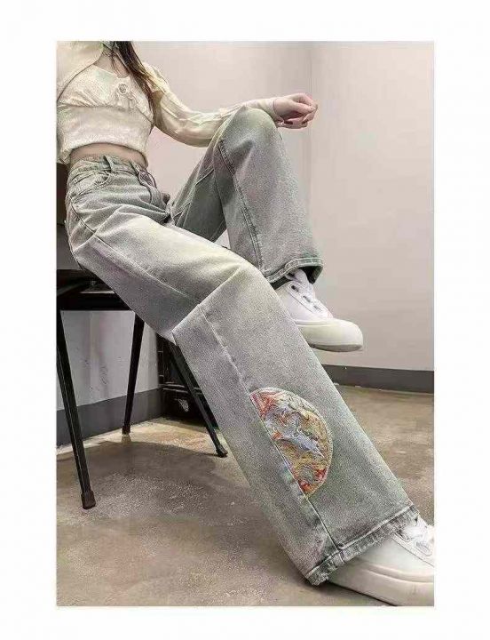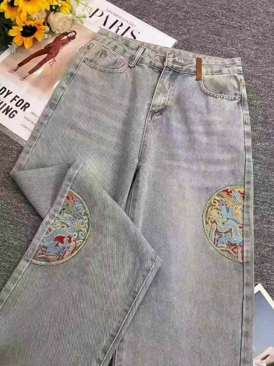 秋季新款洗水棉网红复古国风刺绣直筒阔腿牛仔长裤,独...