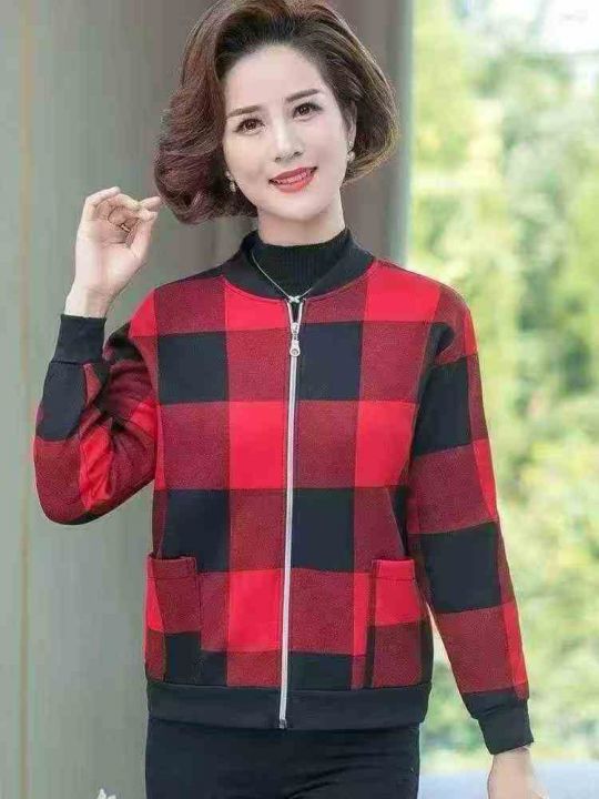 妈妈装圆领拉链夹克开衫春秋款,百搭格子款外套,加绒...
