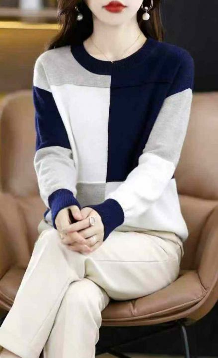 秋冬新款撞色拼接设计款宽松百搭轻熟女装圆领套头毛衣...