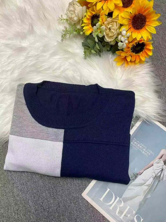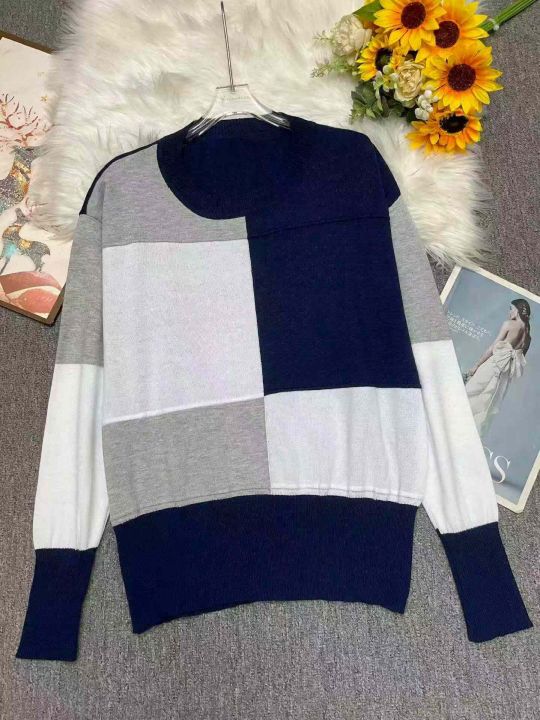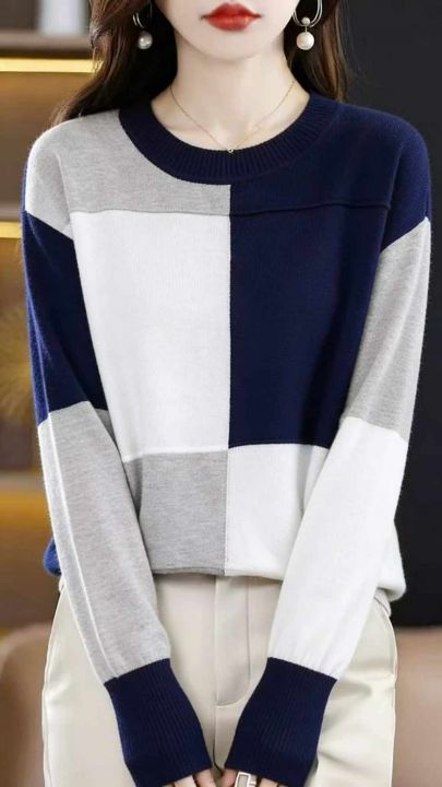 秋冬新款撞色拼接设计款宽松百搭轻熟女装圆领套头毛衣...