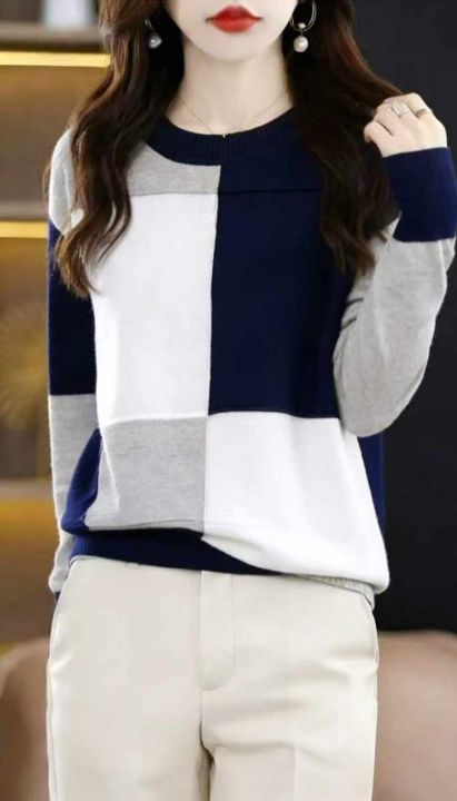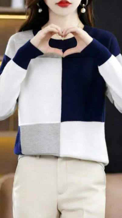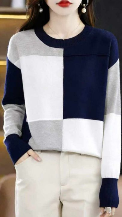 秋冬新款撞色拼接设计款宽松百搭轻熟女装圆领套头毛衣...