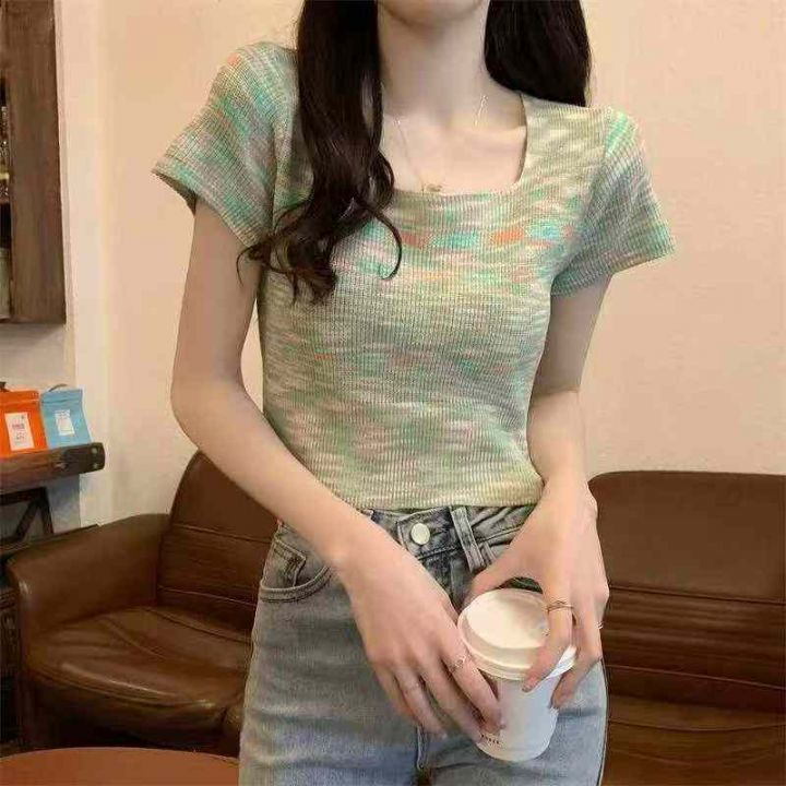 夏季新款撞色彩虹条纹网红爆款短袖针织衫,独立包装,均码面料柔软舒适弹力...
