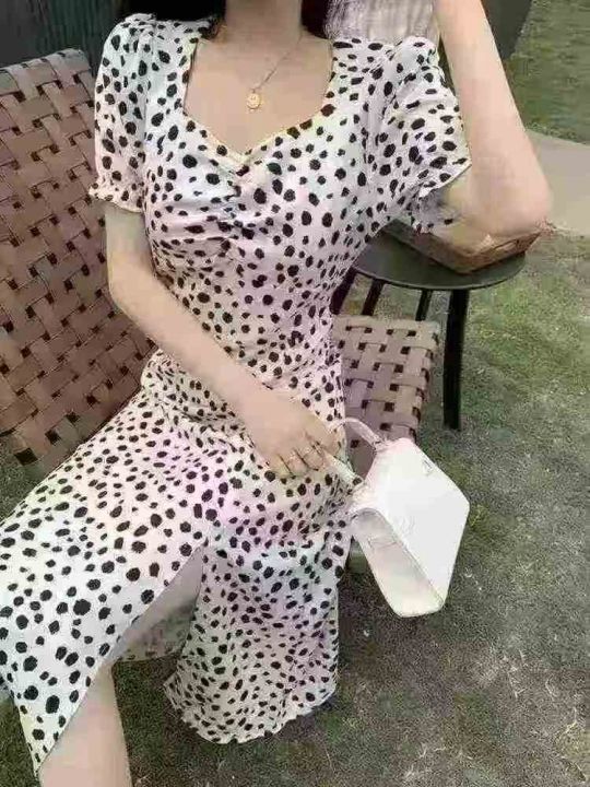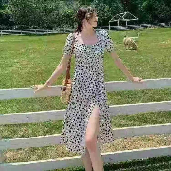 夏装热卖泡泡袖收腰显瘦气质法式复古碎花开叉过膝雪纺中长连衣裙,整款,独立包装,码数L-3XL,L码裙长102厘米,数量207条,(货号0913#41)