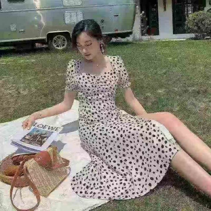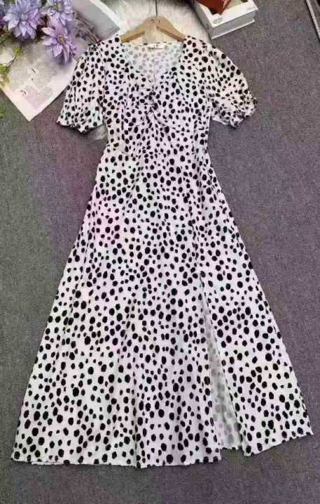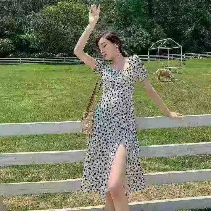 夏装热卖泡泡袖收腰显瘦气质法式复古碎花开叉过膝雪纺中长连衣裙,整款,独立包装,码数L-3XL,L码裙长102厘米,数量207条,(货号0913#41)